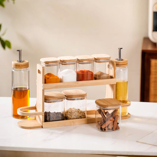 Storage Rack With Set of 7 Spice Jars And Oil Dispensers